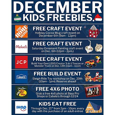 December Kids Freebies Events-Multiple Home Depot, Michael's, JC penny, Bass pro, Etc