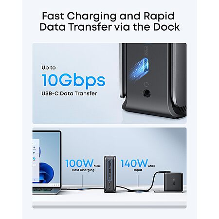 - Fast Power Delivery and Data Transfer: Deliver up to 100W to your laptop while transferring data at speeds up to 10 Gbps via USB-C. The dock supports up to 140W max input from the included power adapter to maintain stable power for all connected devices.
