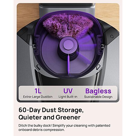 About this item- No Emptying for 60 Days: All-new patented onboard debris compression lets you ditch the bulky self-empty station! G10+ bagless robotic vacuum quietly collects and compacts debris in the spacious 1L dustbin, and keeps the interior hygienic with built-in UV light.