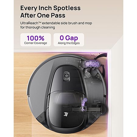 - Reach 100% Edges & Corners: UltraReach extendable side brush sweeps debris out of all corners, while the self-adaptive mop consistently hugs edges, even under furniture, for a truly gap-free cleaning.