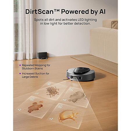 - Target & Tackle Dirt All by Itself: AI-powered DirtScan detects dirt, even in low light with built-in LED lighting, and intelligently adjusts suction, water flow, and cleaning strategies for each type. No manual tweaking needed.