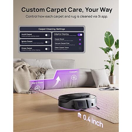 - Custom Carpet Care, Your Way: Enjoy this ultra-smart 3i robot vacuum for carpet cleaning and care! Automatically lift the mop and boost suction on low-pile carpets, avoid shaggy rugs, perform double cleans, and more, all tailored via the 3i App.