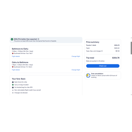 Southwest Airlines and Expedia have round trip airfares travelling to and from Baltimore MD (BWI) and Oahu Hawaii (HNL) for $307, making 1 stop both ways. These are basic economy fares, a restricted-type fare that allows a personal item and a carry-on bag. There is no seat selection and no more free checked bags on Southwest.