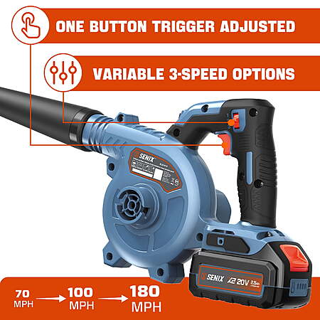 Model: SENIX 20V Max* Cordless Blower with 2.5Ah Battery & Charger Included, Variable 3-Speed Up to 180 MPH/75 CFM, Lightweight BLX2-M